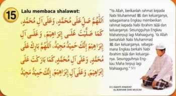“Ya Allah, berikanlah rahmat kepada Nabi Muhammad shallallahu ‘alaihi wasallam dan keluarganya, sebagaimana Engkau memberikan rahmat kepada Nabi Ibrahim ‘alaihissalam dan keluarganya. Sesungguhnya Engkau Mahaterpuji lagi Mahaagung. Ya Allah berkahilah Nabi Muhammad shallallahu ‘alaihi wasallam dan keluarganya, sebagaimana Engkau berkahi Nabi Ibrahim ‘alaihissalam dan keluarganya. Sesungguhnya Engkau Mahaterpuji lagi Mahaagung.” [51]