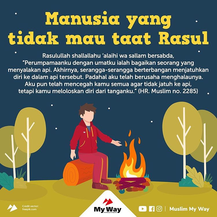 Inilah yang dijelaskan oleh Nabi shallallahu ‘alaihi wa sallam mengenai keadaan beliau dengan umatnya. Beliau permisalkan dengan seseorang yang menyalakan api, lalu berkerumullah serangga di sekeliling api tersebut. Inilah yang biasa dilakukan oleh serangga-serangga kecil ketika ada api, mereka akan segera mengerumuni api tersebut. Namun ketika ada yang ingin menjerumuskannya dalam kebinasaan seperti api tersebut, maka Nabi shallallahu ‘alaihi wa sallam menghalanginya. Namun ada saja yang enggan mengikuti Rasul atau tidak mau taat Rasul dan dimisalkan seperti serangga yang lepas dari tangan Rasul shallallahu ‘alaihi wa sallam.