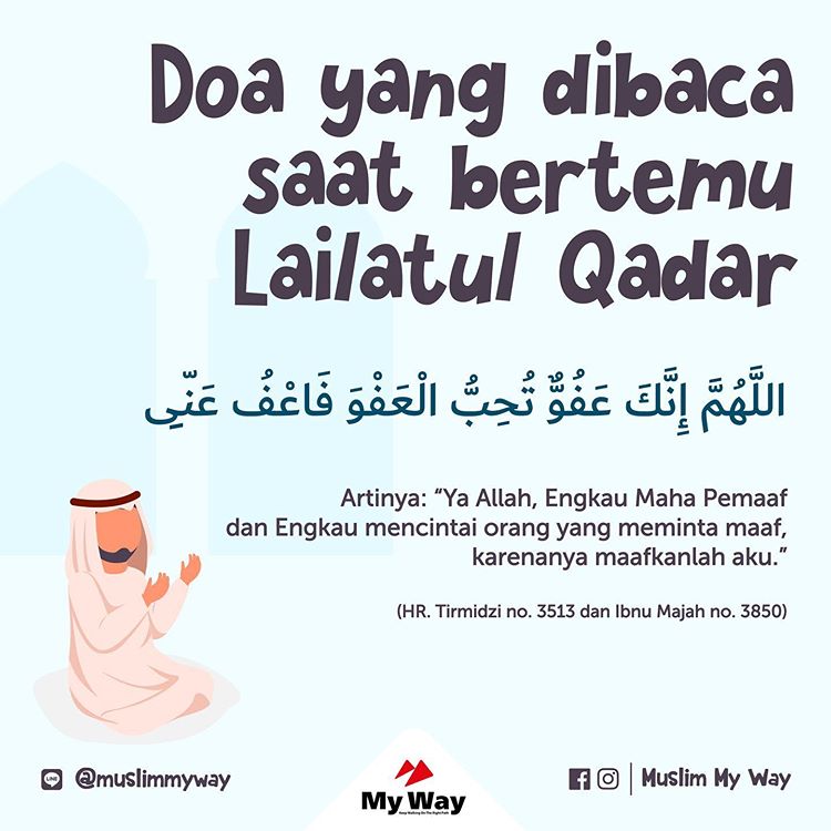 Dari ‘Aisyah radhiyallahu ‘anha, ia berkata, “Aku pernah bertanya pada Rasulullah shallallahu ‘alaihi wa sallam, yaitu jika saja ada suatu hari yang aku tahu bahwa malam tersebut adalah lailatul qadar, lantas apa doa yang mesti kuucapkan?” Jawab Rasul shallallahu ‘alaihi wa sallam, “Berdo’alah: Allahumma innaka ‘afuwwun tuhibbul ‘afwa fa’fu’anni.” (HR. Tirmidzi no. 3513 dan Ibnu Majah no. 3850).