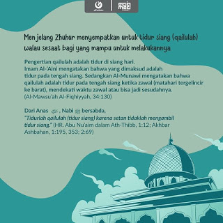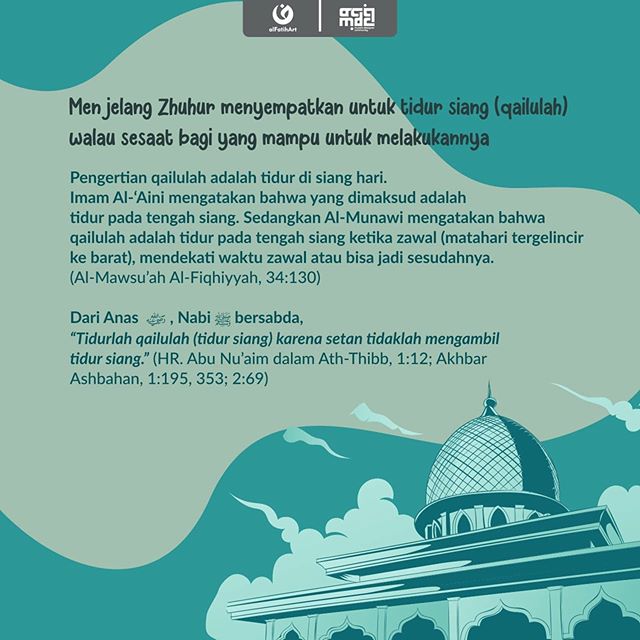 “Tidurlah qailulah (tidur siang) karena setan tidaklah mengambil tidur siang.” (HR. Abu Nu’aim dalam Ath-Thibb, 1:12; Akhbar Ashbahan, 1:195, 353; 2:69. Syaikh Al-Albani menyatakan bahwa sanad hadits ini hasan dalam Silsilah Al-Ahadits Ash-Shahihah, no. 1647).